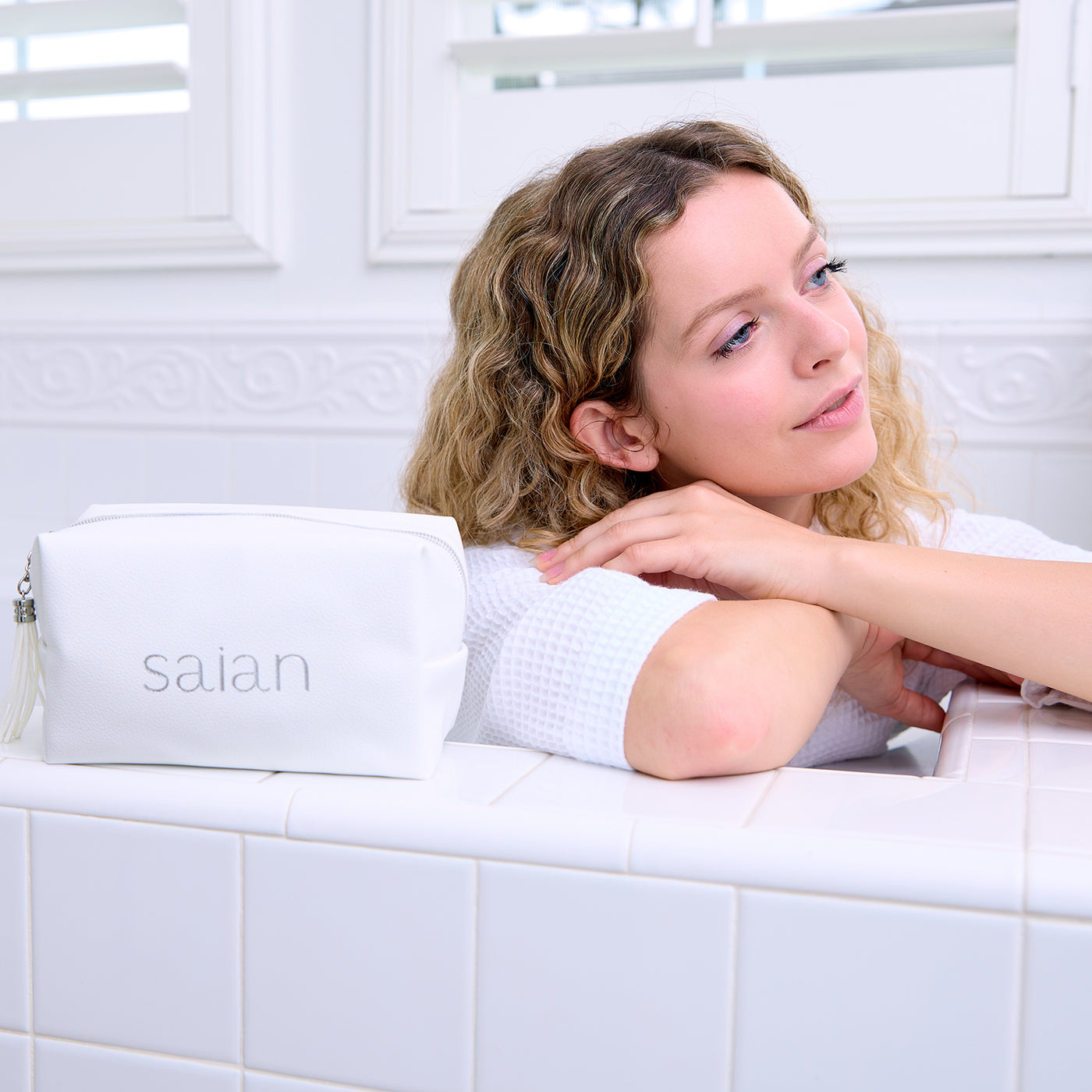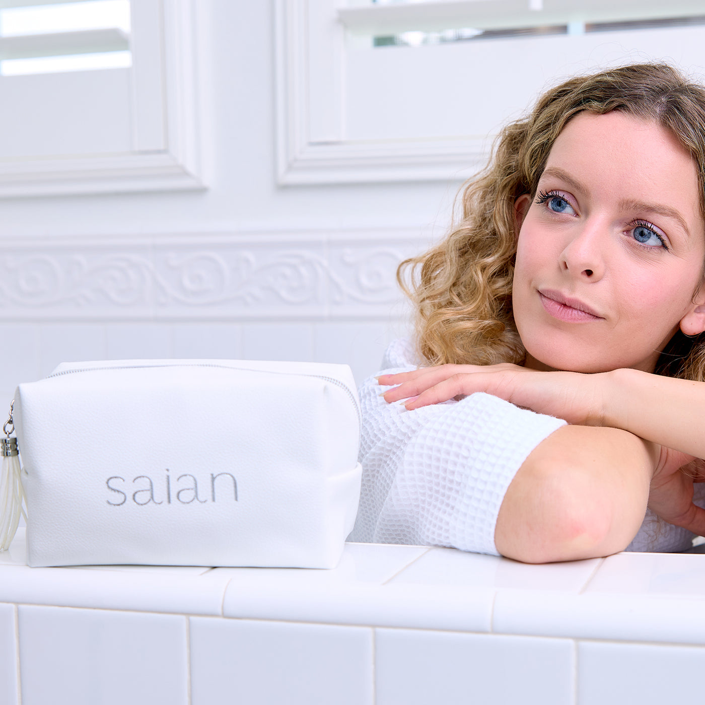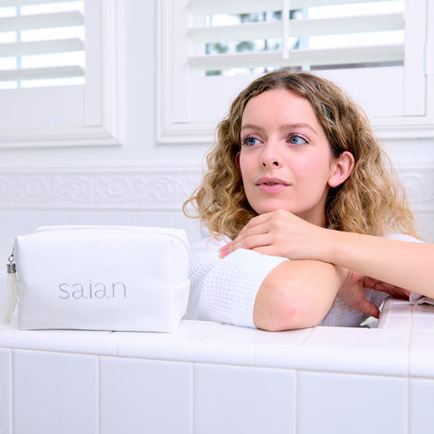 Elevate your skincare routine with the Saian Luxury Vegan Leather Travel Bag—a chic, functional companion designed to hold all your professional skincare essentials in one place. Crafted from premium vegan leather with a soft pebbled texture, this elegant white bag features the embroidered Saian logo in silver thread for a touch of understated luxury.